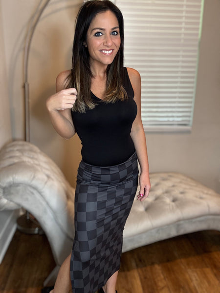 Introducing the Checkered Printed Midi Skirt, perfect for a fun and fashionable look. The super stretchy fabric provides comfort, while the side slit adds a touch of sass. The midi length adds a chic and versatile element to any outfit. Available in black/white and neutral.