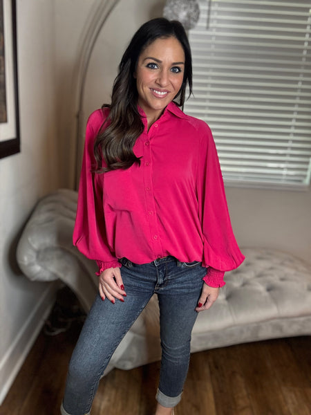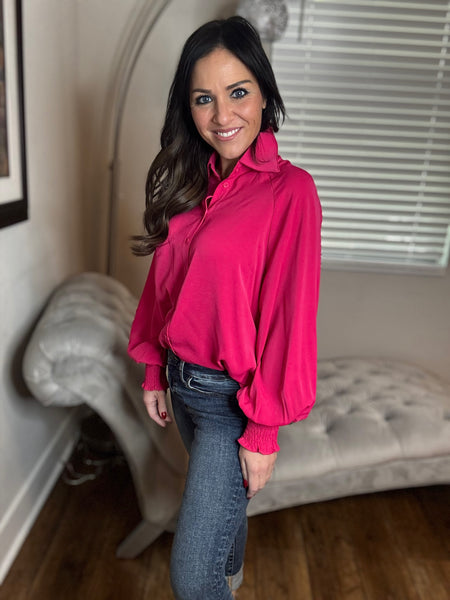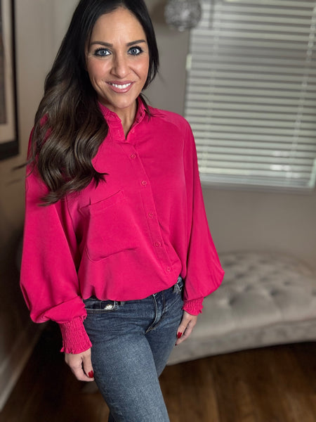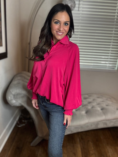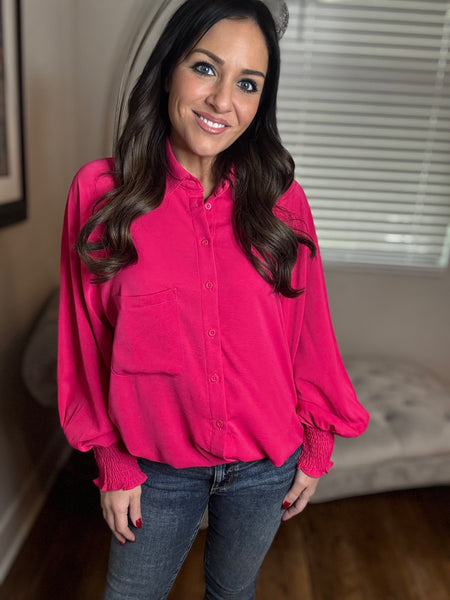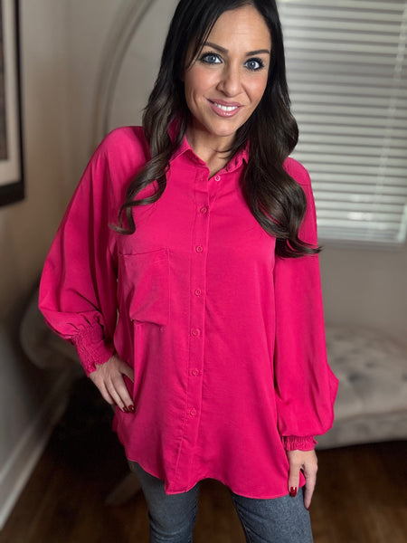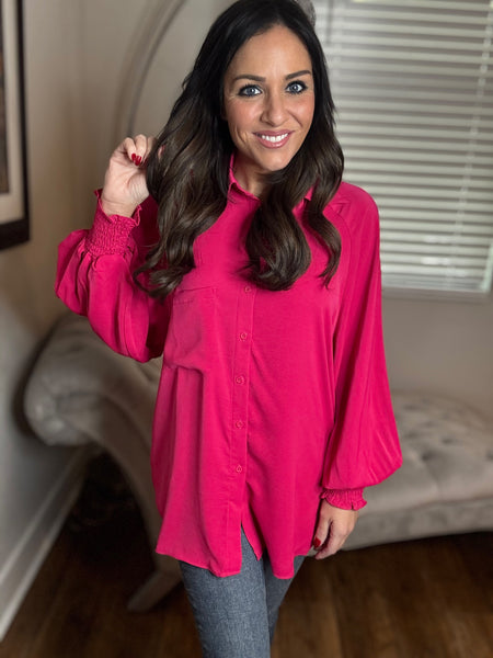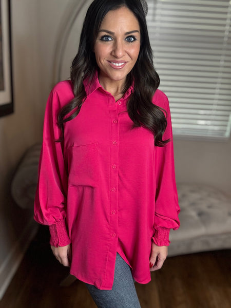 Introducing our luxurious oversized top, made with a lightweight breathable fabric for ultimate comfort and style. The smocking on the wrist adds a touch of elegance, while the button-up design and collar provide a chic look. The hidden side pockets are perfect for storing your essentials. Elevate your wardrobe with this versatile and fashionable top.