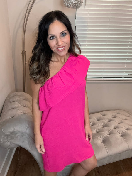Elevate your style in the Simple Moment One Shoulder Dress. This simple but stunning dress features a charming ruffled one shoulder and textured material, perfect for any occasion. Stand out and feel confident in this must-have dress.